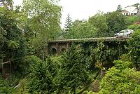 Naší další zastávkou totiž bylo právě zmiňované Monte. To je dnes bráno jako součást Funchalu, ale leží nad ním v nadmořské výšce zhruba 550 metrů (udávaná střední výška, ve skutečnosti od 300 do 800 metrů nad mořem). Původně to byla vilová čtvrť pro nejbohatší obchodníky. Zvláštností je, že sem v letech 1893 až 1943 vedla ozubnicová železniční dráha. Její nejvýše položená stanice byla v nadmořské výšce 867 metrů. Dosud z ní zbyl pár nádražních budov a jeden dnes už silniční viadukt (obr. 30)…