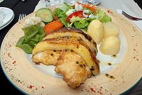 Pak už jsme to vzali nejkratší a nejrychlejší cestou do hotelu, to znamená, že jsme podjeli pod Encumeadou víc jak 3 km dlouhým tunelem a byli jsme zpátky na jižní straně ostrova. A k večeři jsem si konečně dal nejlepší z místních specialit, ešpadu zapečenou s banánem a pokapanou marakujovou šťávou (obr. 126). Možná vám to připadá jako podivná úprava ryby, ale chválili ji i lidé, co jinak ryby moc nemusejí. Hned mi bylo jasné, že tohle nejím během svého pobytu na ostrově naposledy.