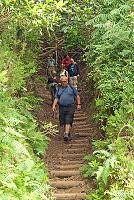 Abychom nemuseli jít stejnou cestou až k Pico das Pedras, přišel Aldonio s jinou variantou, takže jsme za třetím tunelem zahnuli na rozcestí pryč od levády a začali sestupovat lesní cestou k vesničce jménem Ilha (= ostrov; čte se Ilja). Cesta vedla často hlubokým korytem v lese, ovšem i zde většinou vylepšeném schody (obr. 143 a 144). Nad Ilhou jsem vyfotil i jeden citronovník s plody (obr. 145). Pak už jsme došli k našemu mikrobusu a po krátkém mezipřistání u supermarketu ve městečku Santana zamířili zpátky na jižní stranu ostrova a k našemu hotelu.