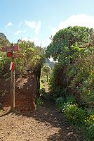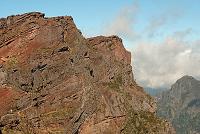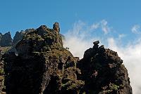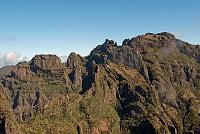 … Šli jsme po vzorně upravené cestičce, na které výškové rozdíly překlenovala různá schodiště, směrem k hoře Pico do Cidrao (1798 m), před kterou se naše cesta stočila směrem k Pico do Gato (= kočičí hora; 1780 metrů). Jedním z rozeznatelných bodů na cestě je vyhlídka Ninho da Manta (= hnízdo káňat; obr. 151 a 154), odkud je vidět do údolí, na okolní hory (obr. 152) i na cestičku vytesanou na jejich stěnách (obr. 153). Pokračovali jsme přes další vyhlídky pod dalšími horami (obr. 155), kolem se tyčily lávové výčnělky připomínající zdi (obr. 156), na vrcholcích skal stály velké šutry (obr. 157) a někde vedla cesta bránou vytesanou do jedné z lávových stěn (obr. 158). Před tunelem pod horou Pico do Gato rostla spousta netřesků a kousek za ním (obr. 159) se cesta rozdvojovala (obr. 160). Zatímco vpravo vede cesta příkrým svahem po stěně hory Pico das Torres (= hora věží; 1847 m), cesta vlevo je kratší a směřuje k dalšímu tunelu. Obě vedou na Pico Ruivo, my šli tou kratší a snazší…
