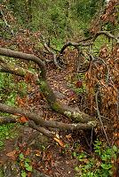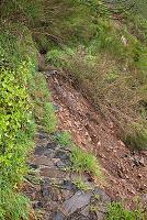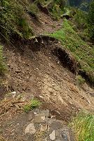… Chvílemi drobně pršelo, občas přestalo úplně a i po více jak hodině chůze jsme u cesty potkali obdělávaná políčka místních zemědělců (obr. 191), kteří si v těchto neobydlených oblastech vážně zasluhují obdiv. Překážky v cestě nás ustavičně udržovaly v pozornosti (obr. 192), až začala cesta stoupat. Pokračoval jsem dál nezměněným tempem a občas jsem díky spoustě zákrut někde za sebou spatřil pár barevných bund. Později jsem je přestal vídat úplně. Říkal jsem si, že až narazím na něco, přes co už se nedostanu, nebudou se muset tak daleko vracet. Turistický chodníček někde sjel ze srázu, který byl pod ním (obr. 193), jinde ho přetínaly vymleté brázdy (obr. 194), ale překonat šlo všechno. Lepší bylo nemyslet, kde bych se asi zastavil, kdyby mi ujela noha.