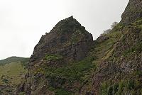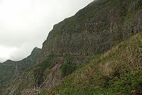 Tak jsem čekal na zbytek naší skupinky. Před sebou jsem měl vrchol Pico do Serradinho (obr. 196; 1443 m), za sebou cestičku na úbočí hory Pico Grande (obr. 197). Nakonec nás bylo pět, čas pokročil do doby, kdy jsme plánovaný příchod k mikrobusu nemohli stihnout ani náhodou, a Ilja stále nikde. Tak jsem opět vyrazil, abych zjistil, jakou trpělivost má náš šofér. Chvíli se mnou šla také Mery, ale pak se zasekla a zůstala stát. Městečko Curral das Freiras (obr. 198) se přibližovalo pomalu. Sestup (obr. 199) byl dost nepříjemný: soustavně prudký sklon cestičky tvořené mokrými kameny, po kterých jsem kráčel v promočených botách, občas byla na cestičce tráva, po které to ujíždělo, a také hlína dobře klouzala pod podrážkami – a dno té díry pode mnou jakoby se ani moc nepřibližovalo.